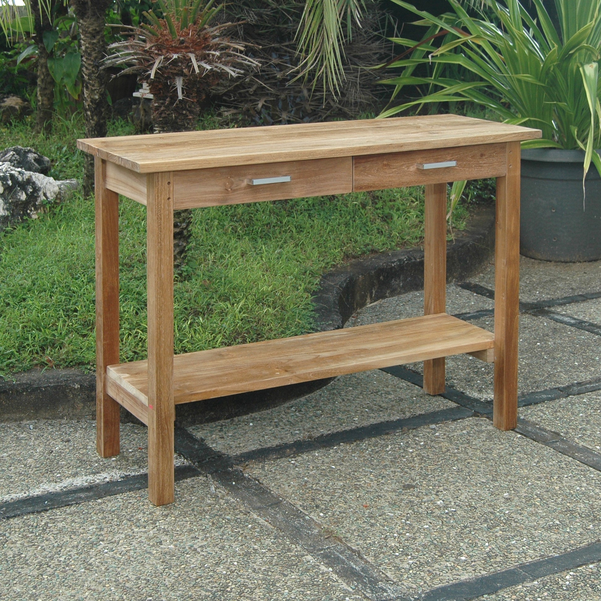 The Atlanta Serving Table is a classic, functional, and sturdy table perfect for the patio or yard. It is designed with two drawers and a bottom shelf to put boxes or other goods under the table. Built with premium teak wood and stainless steel drawer handles, it’s the perfect materials for weathering the outdoors through rain, hail, or shine. The unfinished natural color of the unfinished smooth sanded teak wood is sure to blend with any outdoor environment or décor.