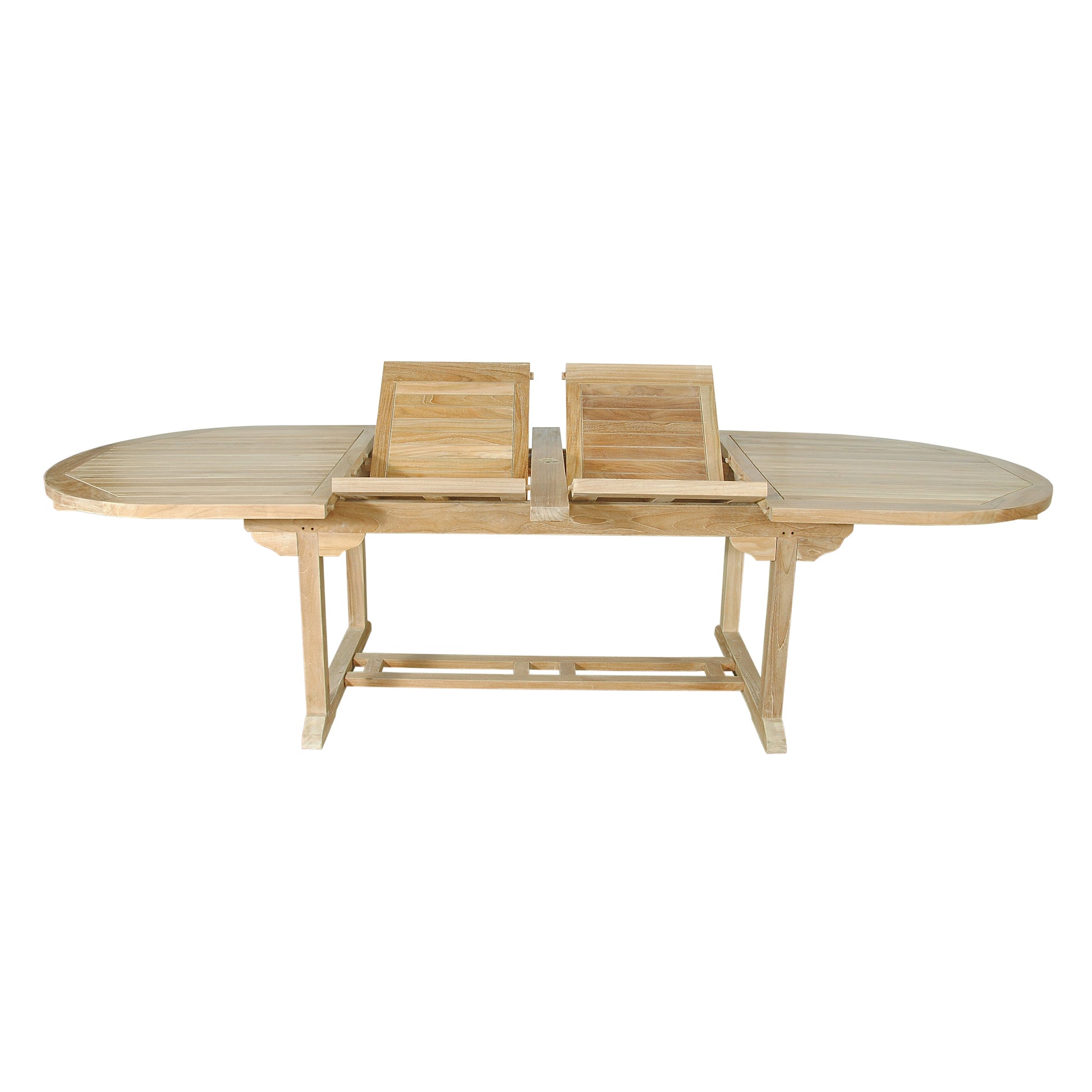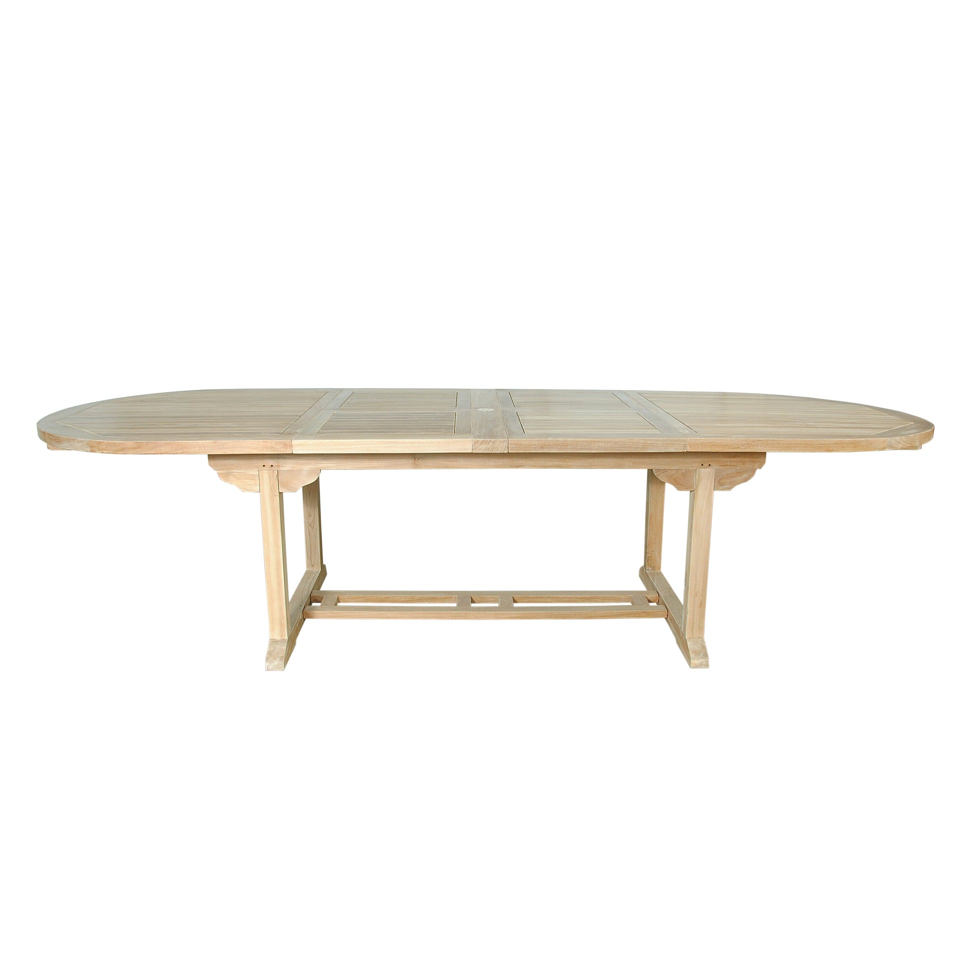 This Bahama Oval Double Extension Table stands 29″ high, 43″ wide by 78″ in length. The Table’s length reaches 117″ when opened and fully extended seating up to 10-12 people comfortably. The table has a unique built-in butterfly pop-up leaf which enables you to open and close one or both leaves of the table in 15 seconds when extra space is needed. The leaf folds away for easy storage under the table when not in use. Includes Umbrella hole in center with brass plug when not in use. Built of Premium A-Grade Teak sanded smooth unfinished.