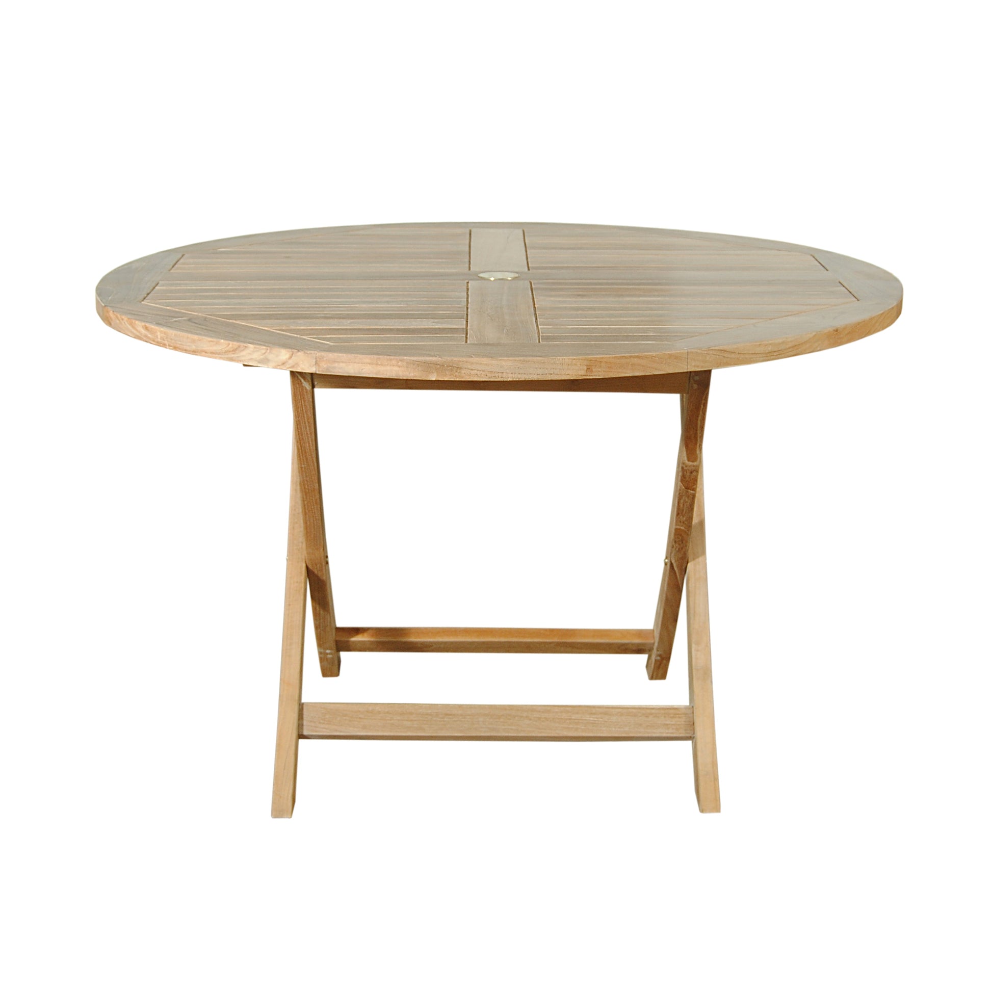 This Bahama 47” Round Folding Teak Table makes the perfect addition to your patio, garden, or yard. Fold it up and carry it away for easy storage and portability. Made of Natural Teak wood ensures fitness for the outdoors and strength against weathering. Features umbrella hole in center with brass plug.