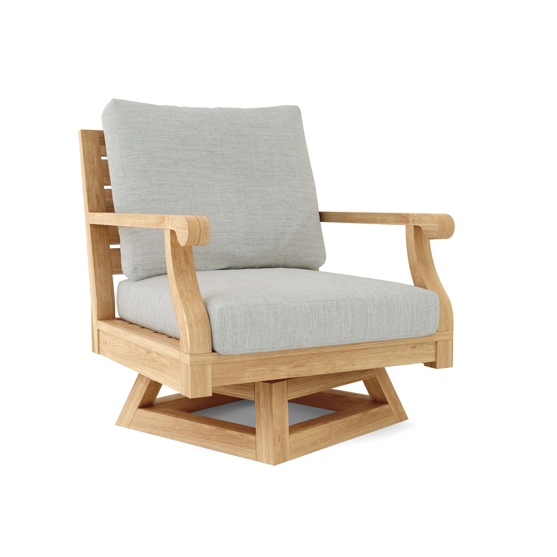 The Riviera Swivel Armchair is a standout piece of furniture that blends deep seating comfort with swivel functionality. At first glance, its considerable size and quality built frame becomes apparently noticeable complementing its stylish curved design and armchair whorl. Add other pieces from the Riviera Luxe Deep Seating set as coffee tables, couches, ottomans, and chairs, or use individually as a single piece to complement any décor or area. Constructed with Premium Teak wood natural unfinished. Swivel functionality up to 360 Degrees for comfort. Sunbrella Cushions and color choice included. Be sure to speak with your representative.