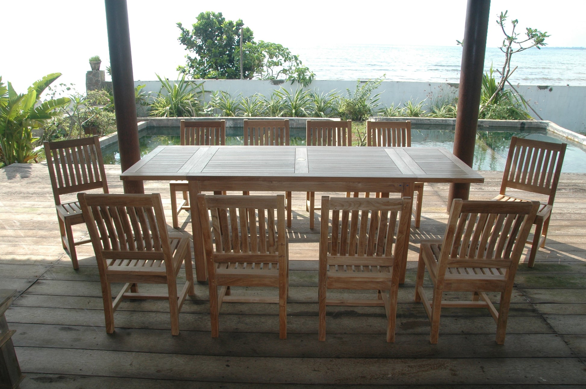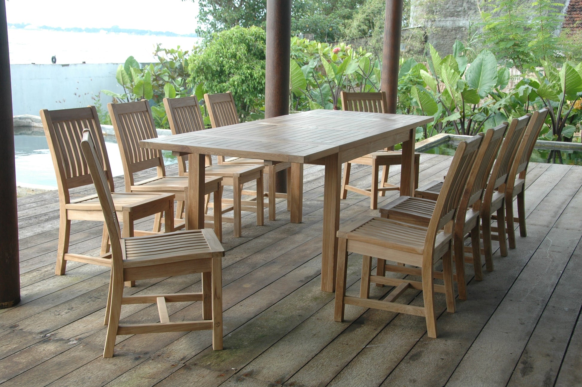 This solid Teak “Rectangular Extension Table” makes the perfect addition to your backyard. Our extension table begins as a 59-inch long rectangular and easily extends with detachable leaves to a 95-inch long rectangular in less than 15 seconds. The table can be extend with 1 or 2 leaves, seats 6 to 10 people. Available with umbrella hole. The table is combining with 2 Chicago Armchairs and 4 Chicago Chairs. Both chairs have traditional curved seat and back makes the chair comfortable when sit on it. Add all-weather cushions from Sunbrella for extra comfort. Place this dining table set in your backyard which will amazed your family and friends.